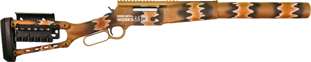 Wren Metal Works Integrally Suppressed Lever Action Silencer System constructed from titanium, 17-4 stainless steel, and 7075 aluminum. Match grade aftermarket barrel chambered in 8.6 with a 1:5 twist.